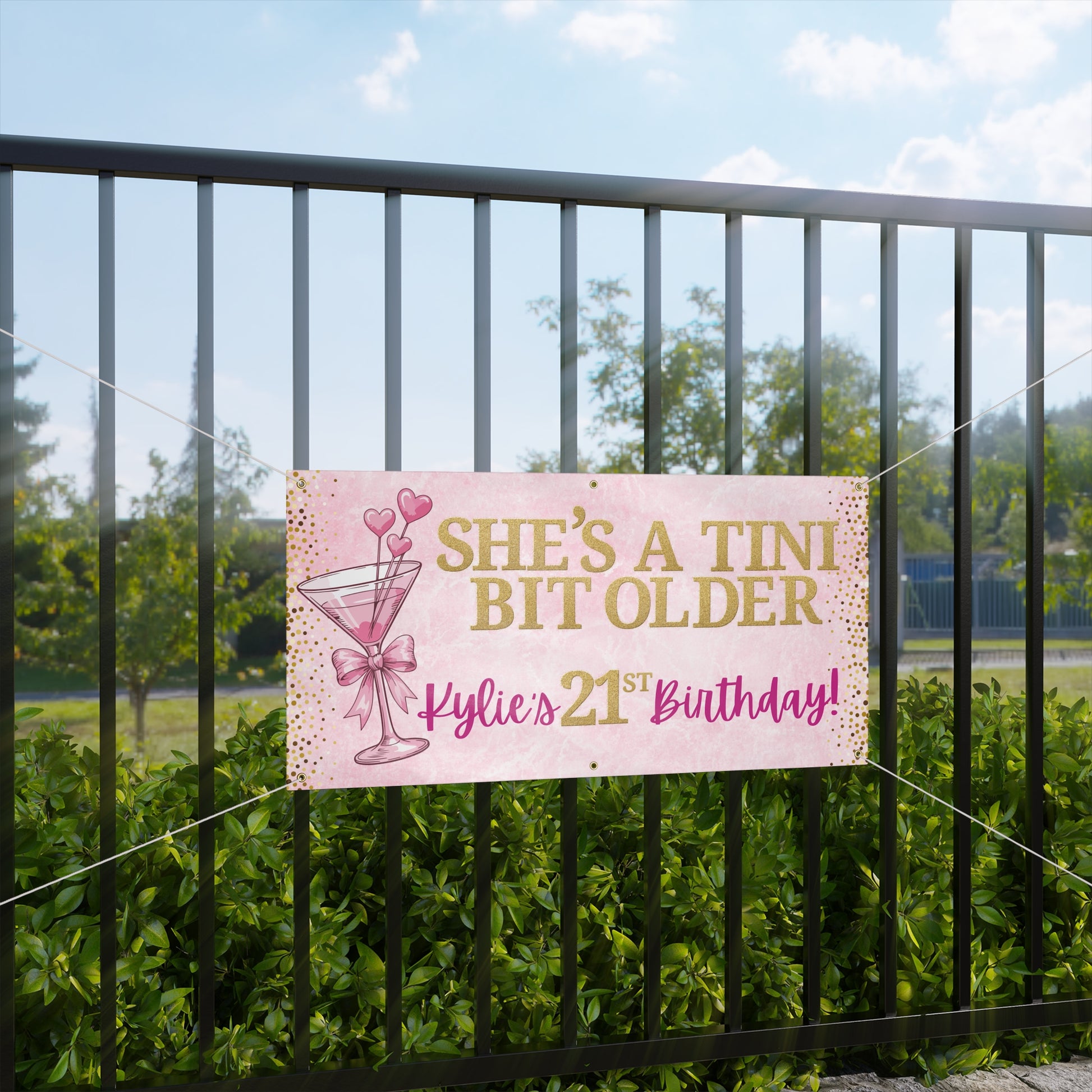 Celebrate a 21st birthday with a banner that feels like the party itself. Soft matte color keeps the gold confetti and pink martini art sophisticated, while the personalization option lets the banner call out the guest of honor by name or nickname. Hang it over a dessert table, across a backyard patio, or behind a DIY photo wall — it blends with bubbly laughter, clinking glasses, and late-night playlists. Lightweight but sturdy, it moves easily between indoor living rooms and outdoor patios, adding a festive, custom touch without shouting. This banner reads like a memory: warm, celebratory, and unmistakably theirs.